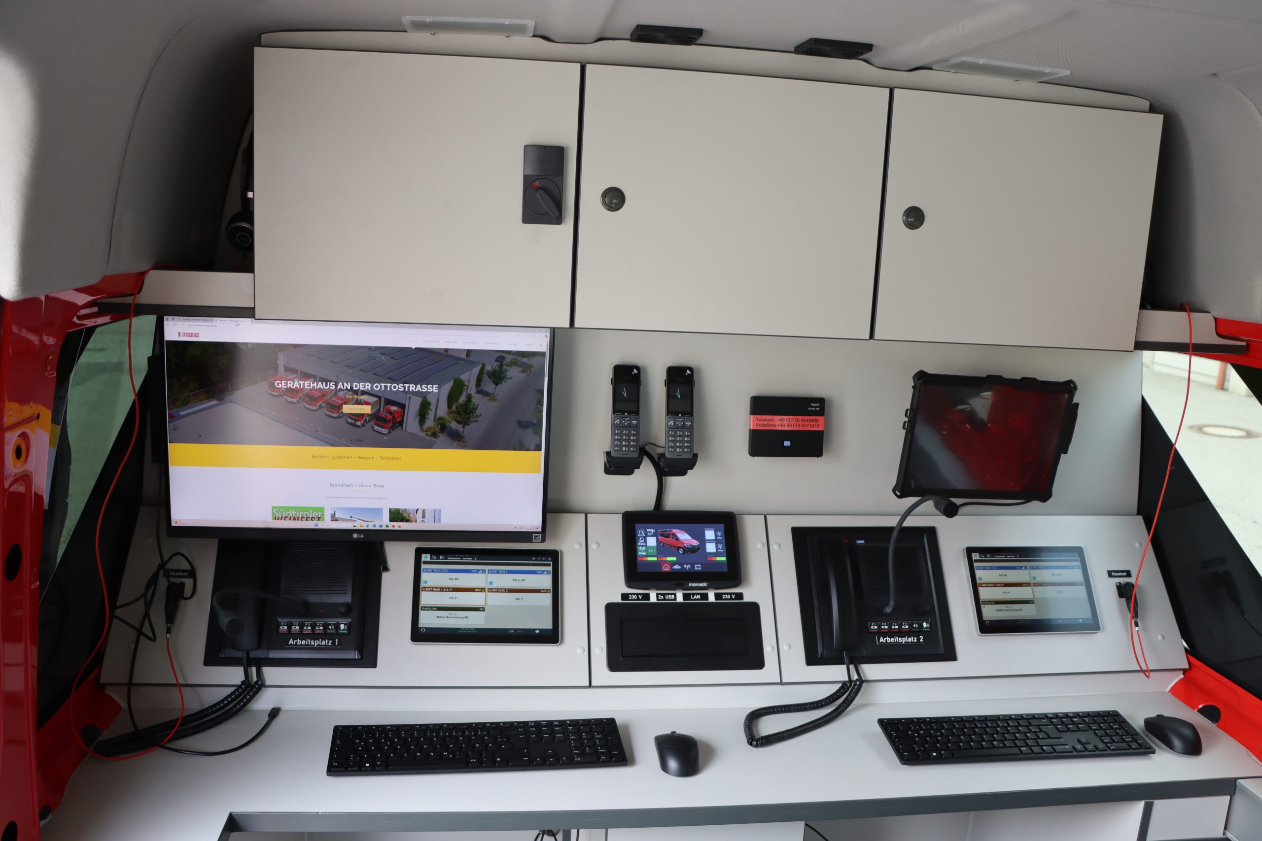 Durch die beidseitigen Ausschübe ergibt sich ein 6,10 Meter breiter und 22 m² großer Innenraum. Nach Aufstellen der mitgeführten Stühle und Klapptische sind 16 Arbeitsplätze vorhanden. Die Wände sind als magnetische Whiteboards nutzbar. An der Stirnseite ist ein ausfahrbarer Mast für die Funkantenne befestigt.