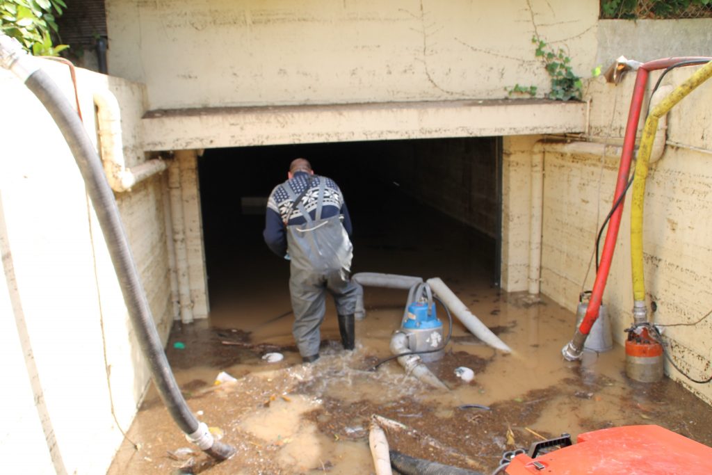 Mit einer Wathose geschützt, ging eine Einsatzkraft in die Tiefgarage hinein, um die Tauchpumpen und Saugkörbe der Tragkraftspritzen zu kontrollieren und von Verschmutzungen zu befreien.