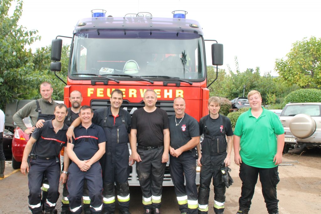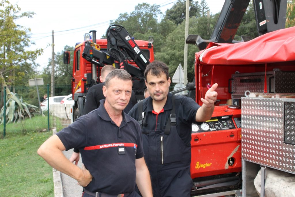 Die Anspannung und Erschöpfung sieht man ihnen an: Kommandant Eduard Klas bespricht die Maßnahmen mit Didier Holton, dem Leiter der mit uns befreundeten Jugendfeuerwehr.
